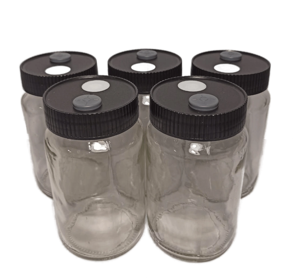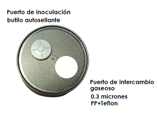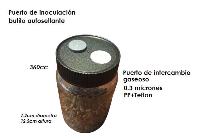 Los frascos son reutilizables y las tapas cuentan con puerto de inyeccion y de intercambio gaseoso de 0.24 micrones de poro, permitiendo al micelio respirar sin que ingresen contaminantes.